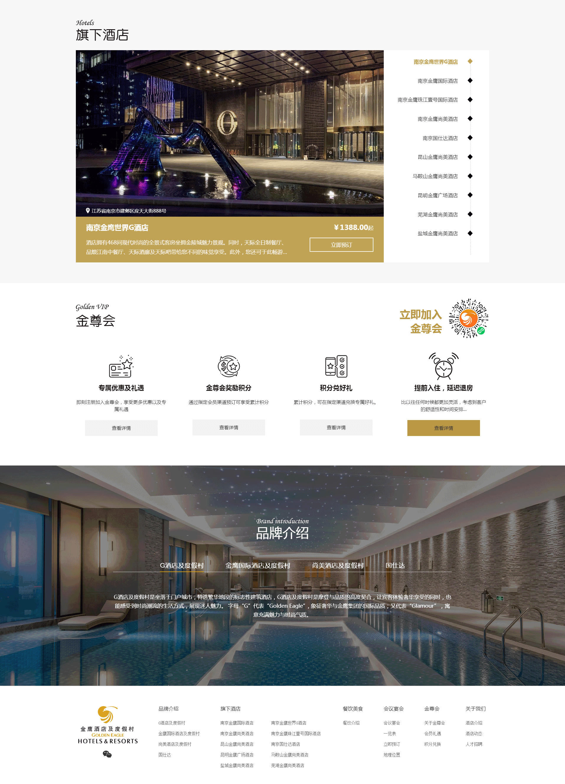 金鷹酒店及度假村管理集團(tuán)創(chuàng)建于2006年,是金鷹國(guó)際集團(tuán)旗下從事酒店運(yùn)營(yíng)、管理及關(guān)聯(lián)服務(wù)的業(yè)務(wù)板塊。我們擁有專(zhuān)屬的忠誠(chéng)客戶(hù)計(jì)劃「金尊會(huì)」以及定位奢華的「G酒店及度假村」、定位豪華的「金鷹國(guó)際酒店及度假村」、定位商務(wù)的「尚美酒店及度假村」和定位生活方式類(lèi)的「國(guó)仕達(dá)」等多個(gè)酒店及度假村品牌。金鷹酒店及度假村集團(tuán)管理的10家酒店分布于江蘇省、安徽省、云南省等區(qū)域內(nèi)的6座門(mén)戶(hù)型城市,未來(lái)還將在大中華區(qū)的多個(gè)地域樞紐型城市繁華地段籌備開(kāi)業(yè)多家奢華和豪華型酒店。